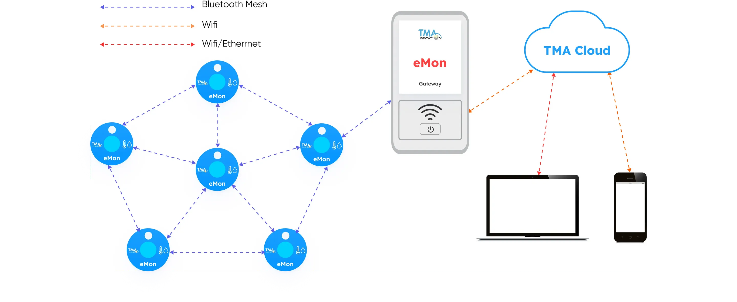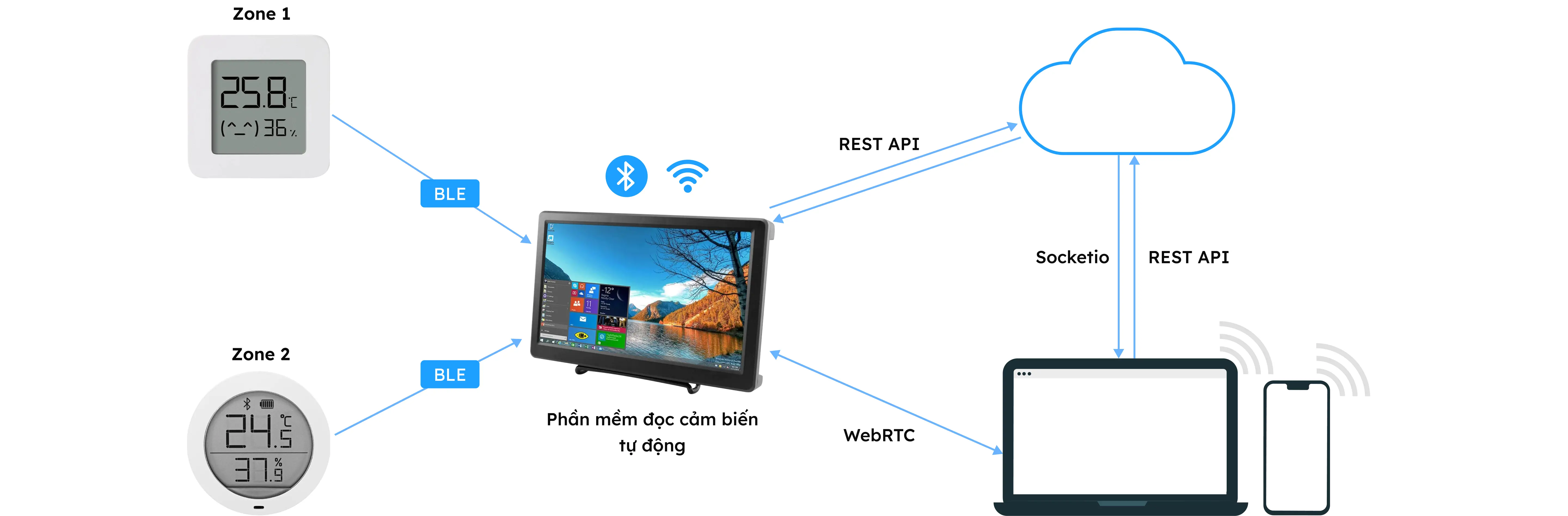 Hệ thống dựa vào công nghệ mới nhất của BLE gọi là BLE Mesh network, cho phép thiết lập các sensor cảm biến môi trường xung quanh như nhiệt độ, độ ẩm,… và gửi về cloud.