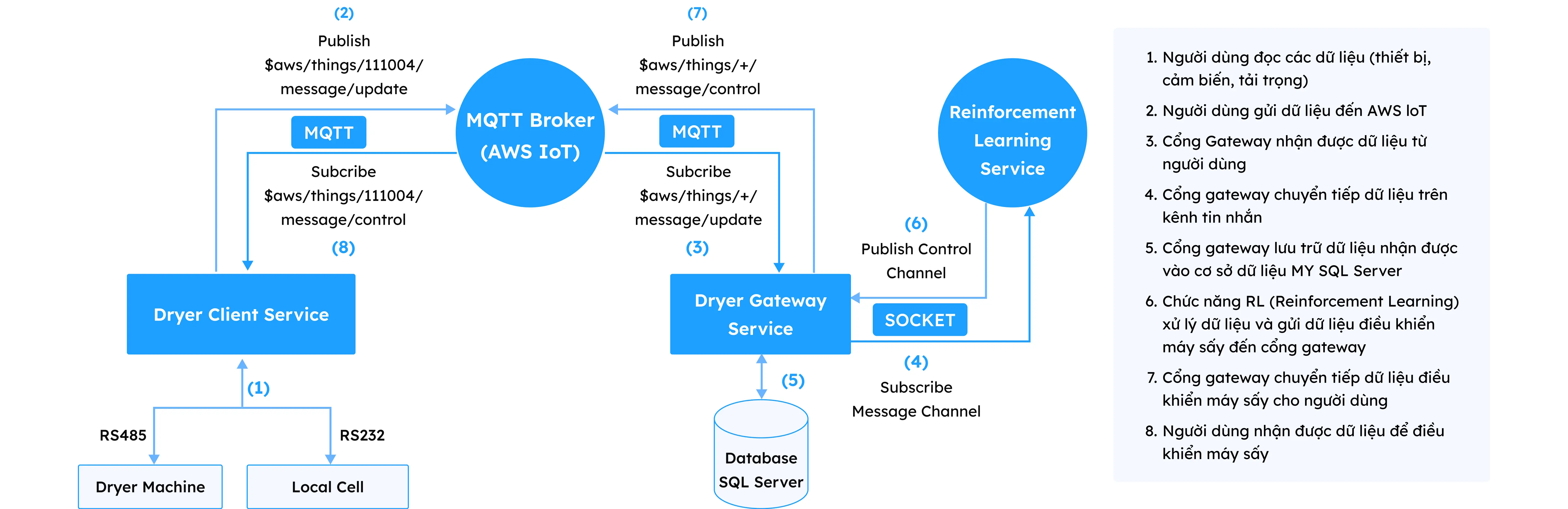 - Tự động hóa và điều khiển máy sấy từ xa. Thu thập dữ liệu trong thời gian thực và gửi lên Cloud.