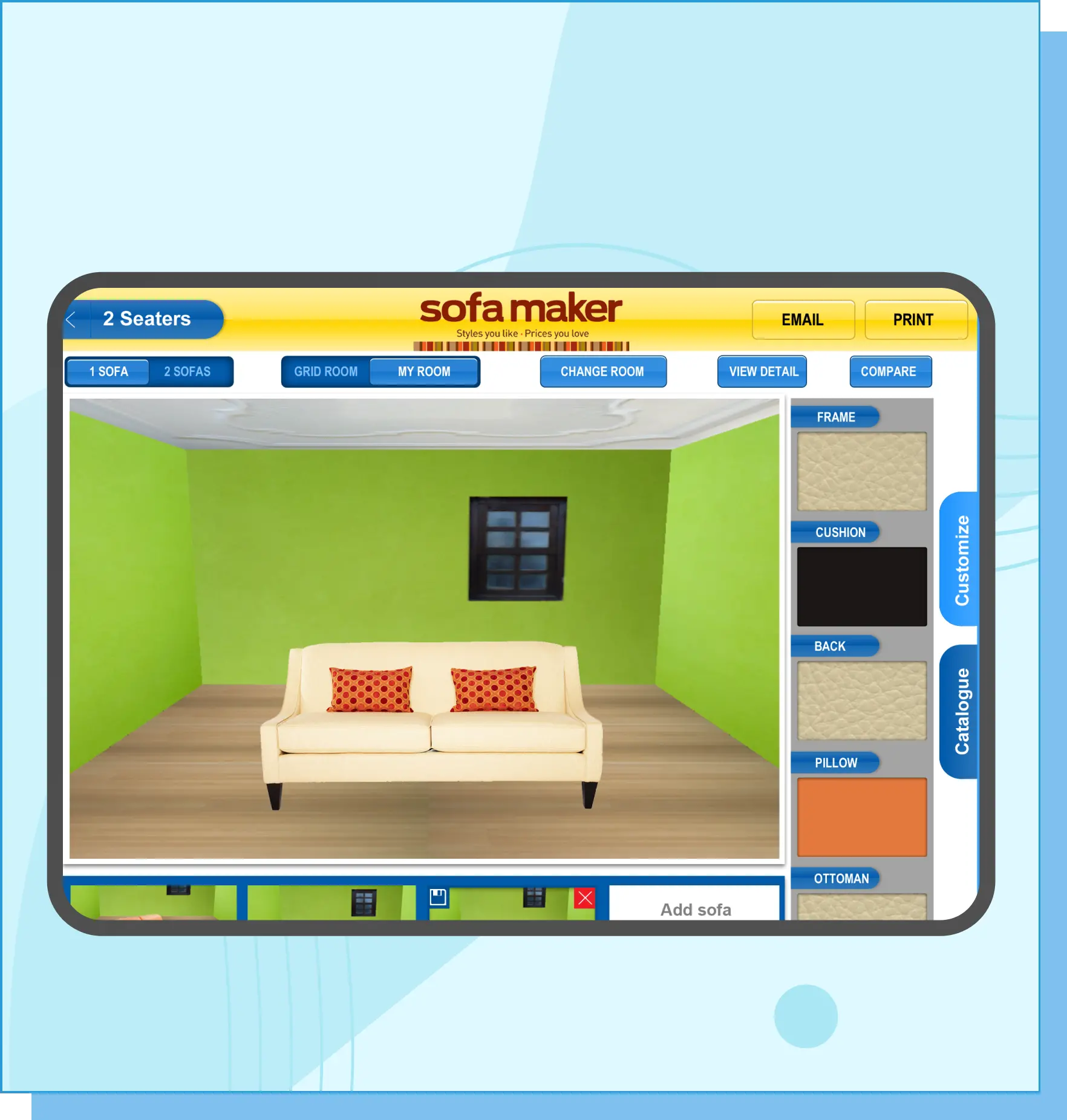 Thay đổi các loại sofa, kiểu dáng, màu sắc chất liệu, vị trí sofa để xem sofa có phù hợp khi đặt để trong căn phòng của bạn. Thay đổi góc nhìn theo chiều ngang hoặc từ trên xuống của căn phòng.