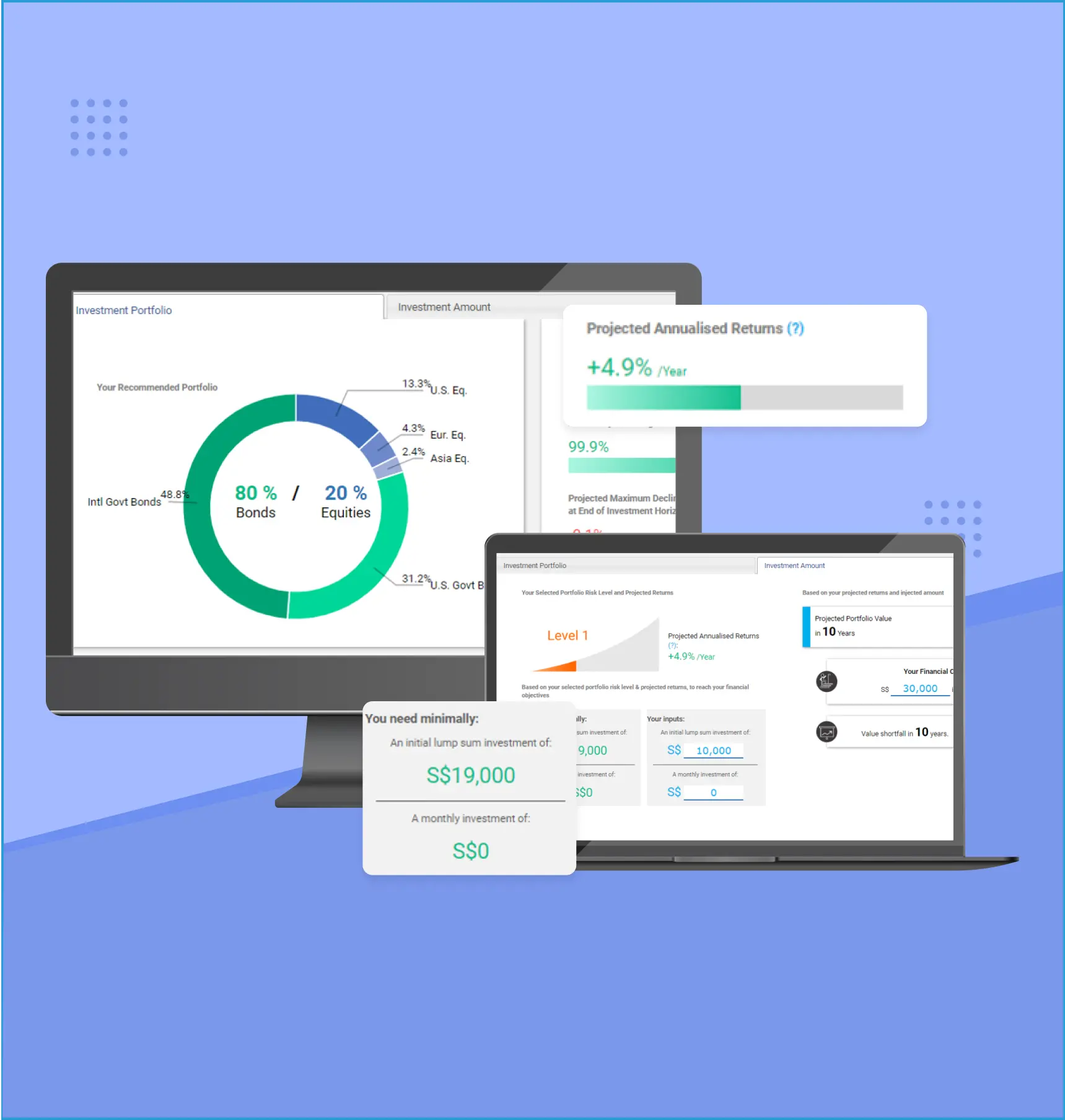 Dựa vào thông tin mức độ chấp nhận rủi ro của nhà đầu tư và các thông tin thị trường, hệ thống sẽ đề xuất các danh mục đầu tư và đưa ra những lời khuyên hữu ích.