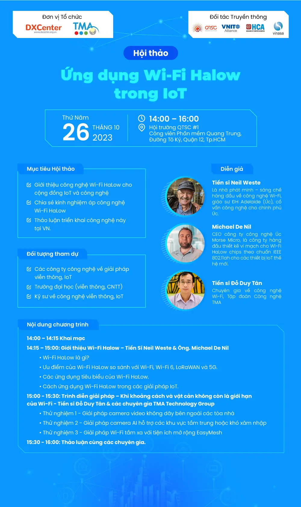 Nhằm giới thiệu các công nghệ viễn thông mới và thúc đẩy ứng dụng IoT trong các lĩnh vực Thành phố Thông minh, Khu công nghiệp và nhà máy thông minh, Nông nghiệp thông minh… Tập đoàn Công nghệ TMA phối hợp cùng với Công viên Phần mềm Quang Trung tổ chức Hội thảo "Ứng dụng Wi-Fi HaLow trong IoT" với các chuyên gia hàng đầu về công nghệ Wi-Fi từ Úc.