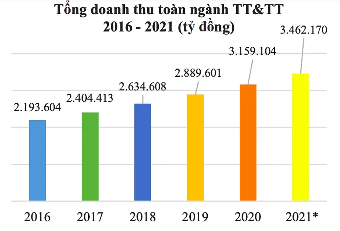 Trong dự thảo báo cáo tóm tắt tổng kết công tác năm 2021 do Bộ Thông tin và Truyền thông vừa công bố, doanh thu ngành Thông tin và Truyền thông Việt Nam đạt gần 3,5 triệu tỷ đồng (gần 151 tỷ USD).