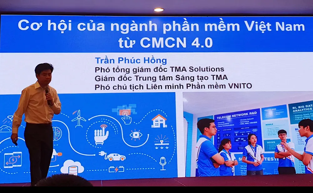 Trong hội thảo này, anh Trần Phúc Hồng đã trình bày các cơ hội mà công nghệ 4.0 mang đến cho ngành phần mềm Việt Nam, kinh nghiệm của TMA và đề xuất TP.HCM mạnh dạn hơn trong áp dụng các công nghệ mới để tăng hiệu quả và lợi thế cạnh tranh và đẩy mạnh đào tạo nhân lực để trở thành trung tâm cung cấp dịch vụ đổi mới sáng tạo ở Đông Nam Á.