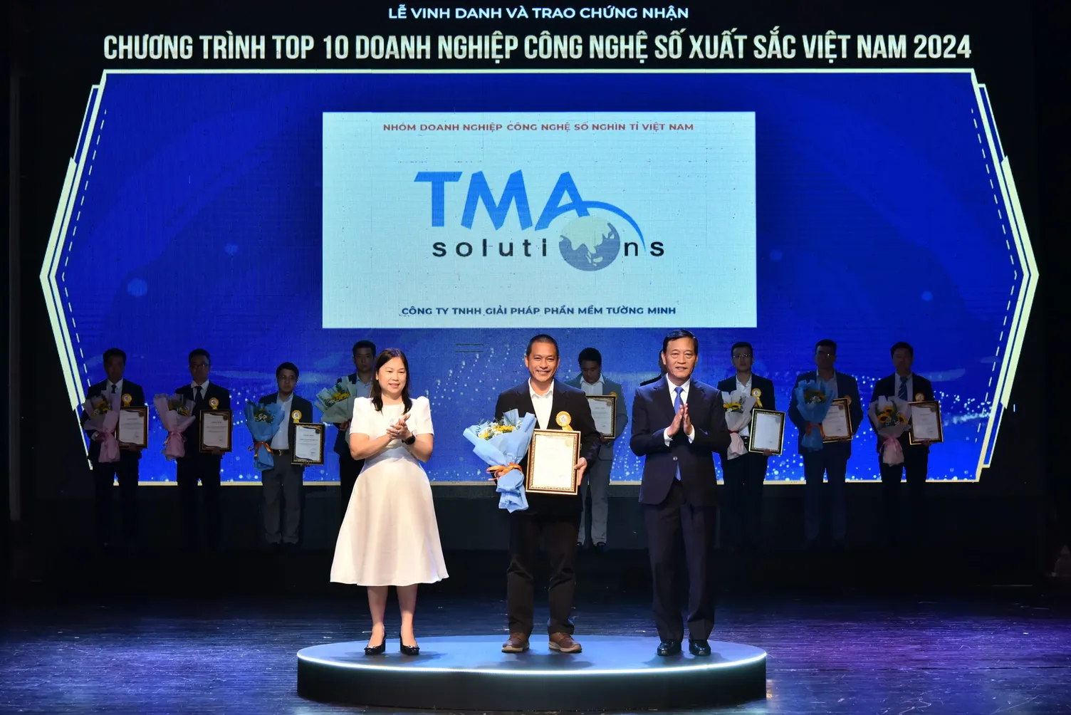 TMA vinh dự được vinh danh trong Top 10 doanh nghiệp công nghệ số xuất sắc Việt Nam 2024, do Hiệp hội Phần mềm và Dịch vụ CNTT Việt Nam (VINASA) tổ chức. Đây là lần thứ 11 giải thưởng được công bố, và TMA tự hào nhận danh hiệu trong hai hạng mục: Top 10 Doanh nghiệp Kinh doanh số và Top 10 Doanh nghiệp Gia công phần mềm.